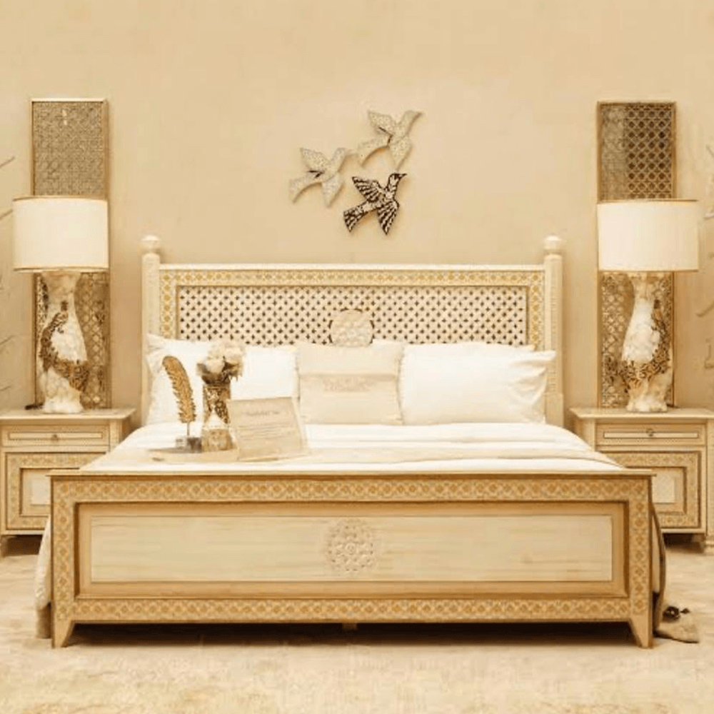 This Royal Chinioti Carved Bed is a statement piece that brings the storied tradition of Chiniot furniture into your master bedroom. Crafted from premium solid sheesham (rosewood), this bed features richly detailed floral and geometric carvings on its headboard and footboard, a hallmark of Chinioti artisanship. The high headboard, adorned with symmetrical motifs, gives it a regal presence and becomes a visual centerpiece. The robust construction ensures durability, while the natural wood grain and polished finish highlight the elegance and warmth of the material. Ideal for those who appreciate heritage design, this bed blends cultural artistry with practical comfort, making it a timeless investment for your home.